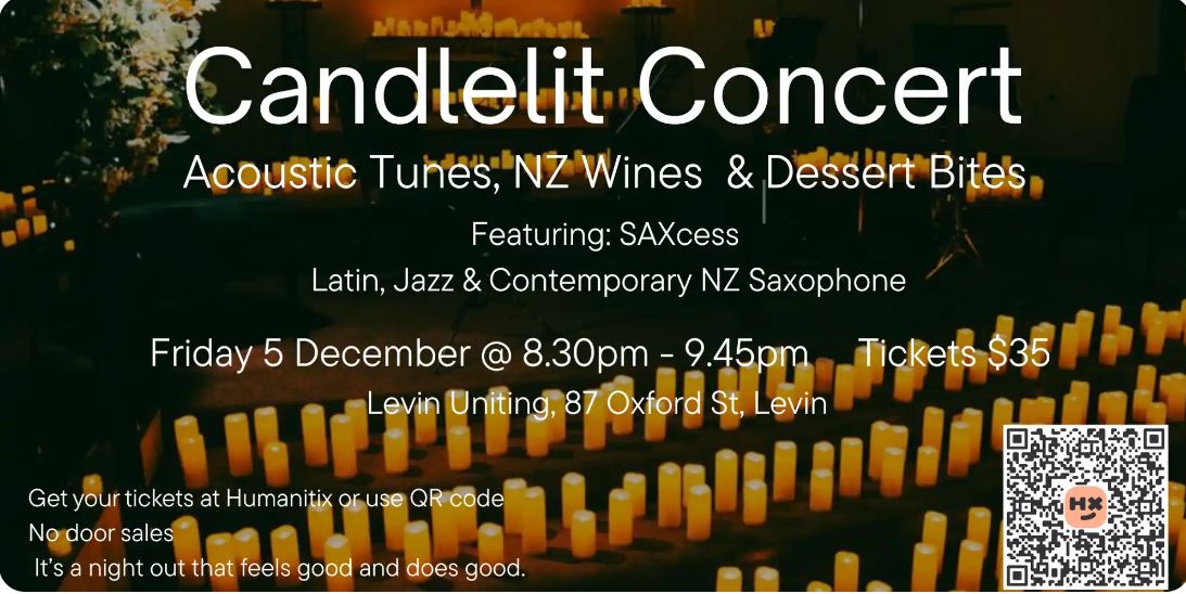 Step into an evening of warmth, wonder, and world-class music. Once each season, the historic Levin Uniting Church and Community Centre transforms into an intimate haven softly lit by 800 flickering candles. Pause, breathe, and connect in a truly magical atmosphere.